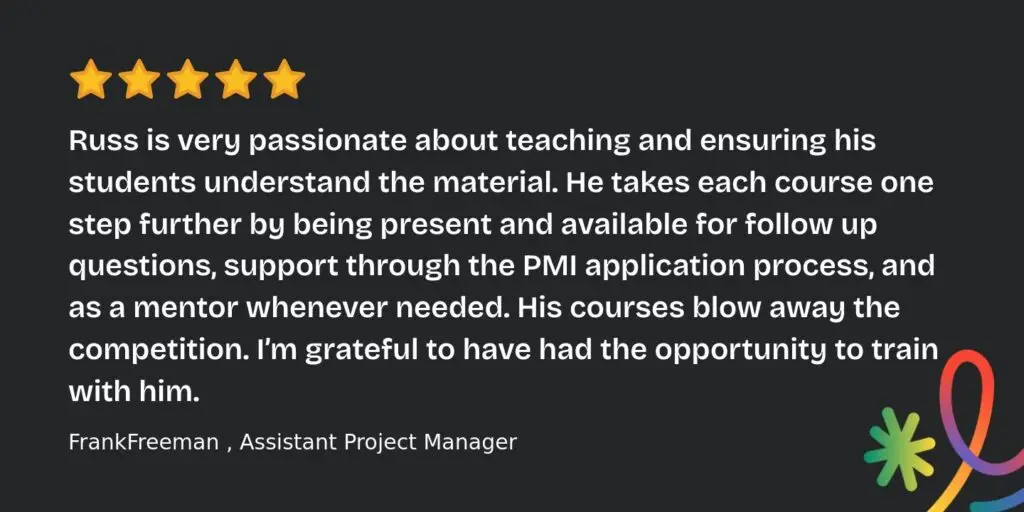 Russ Parker, PMP®, PMI-RMP®, PMI-ACP® is a retired Marine Corps Officer turned Project Manager and has the knowledge, skills, and motivation to get you through the PMP® material and prepared for the exam.